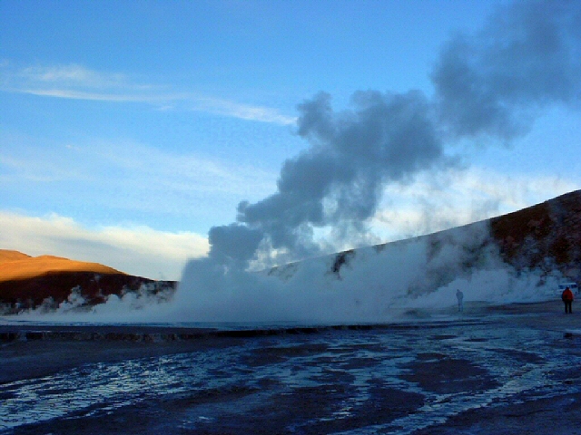 Al amanecer afloran violentos chorros de vapor desde pozones de agua hirviente que tienen sus bordes blandos, formado de sales minerales.