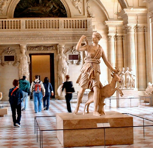 Para los Romanos, Diana acompañada por un ciervo, representa La Artemisa Griega, hermana gemela de Apolo, virgen esquiva y cazadora incansable. La estatua se inspira en un bronce del siglo IV A.C. atribuído a Leochares.