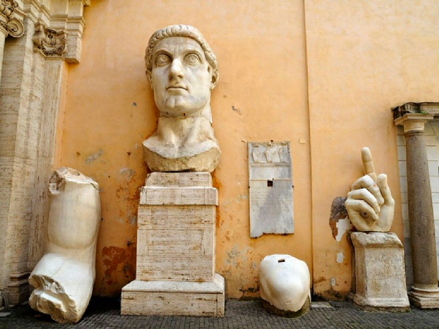 Representaba al Emperador Romano Constantino I el Grande (280-337 d. C ) y que en el pasado ocupó la cabecera oeste de la Basílica de Majencio en el Foro Romano. La gran cabeza, brazos y piernas de esta estatua fueron tallados en mármol, mientras que el resto del colosal cuerpo estaba compuesto de un núcleo realizado en ladrillo y madera, posiblemente cubierta de bronce dorado. La figura sentada medía unos 12 metros de alto.
