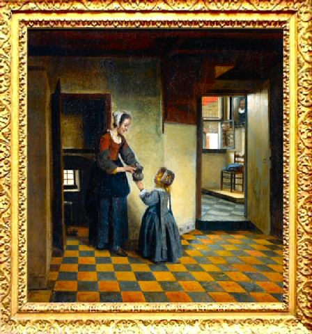 Óleo sobre tela de 60,5 cms. de ancho x 65,0 de alto. Pintado en el año 1660. Es posible que De Hooch haya usado a su esposa y a su hijo